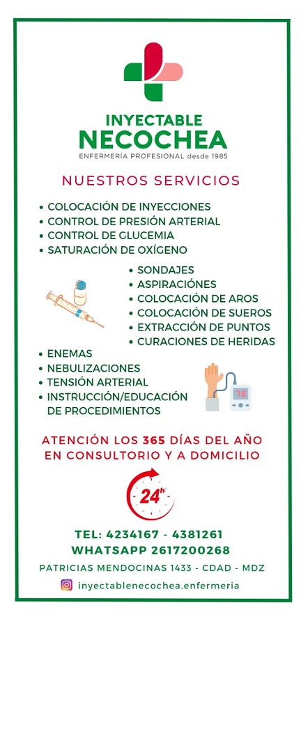 Valoramos la atención al cliente y siempre estamos aquí para usted todo el año. En la actualidad se atienden en el inyectable más de 1000 personas mensualmente. Prestamos serivicios en Mendoza, estamos habilitados para colocar inyecciones, inyección, no le queda Y nuestra institucion tiene más de 50 años